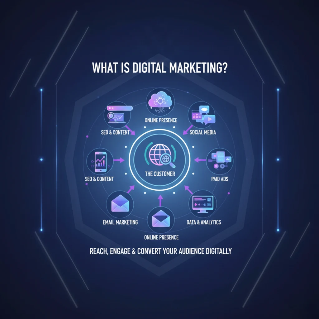 Digital marketing is the practice of promoting products or services online through channels like search engines, social media, email, and websites to reach the right audience, build brand awareness, and drive measurable business growth